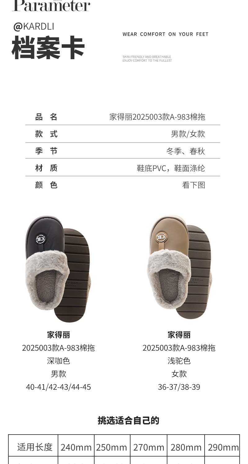 家得丽2025003款A-983深咖色男女款棉拖/44-45(每箱36双)